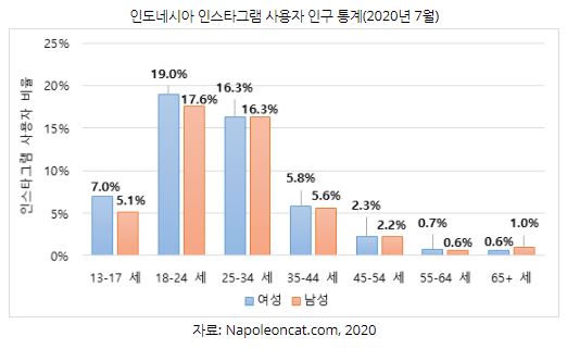 2020년 7월까지 인도네시아의 인스타그램 이용자는 7천380만 명으로 전체 인구의 약 27.12%, 인터넷 접속이 가능한 전체 인구의 42.1%에 달한다. 인도네시아는 전 세계 인스타그램 이용자 수가 미국, 인도, 브라질에 이어 4번째로 많은 국가로 선정됐다. 현재 인스타그램 이용자 중 여성의 비율이 51%로 남성에 비해 다소 높다. 연령대로는 18~24세가 가장 많고, 그다음이 25~34세다. 그것은 마케팅적으로 구미가 당기는 인적 구성이다.