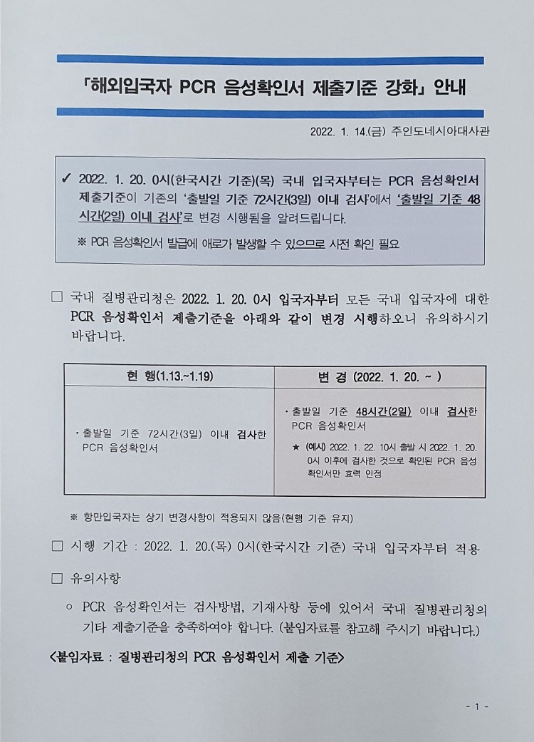 해외입국자 PCR 음성확인서 제출기준 강화 안내