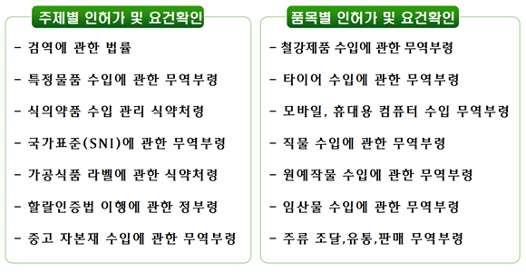 ■ 수출입 인허가 대상 확인 : http://eservice.insw.go.id/수입물품에 대한 주요 인허가